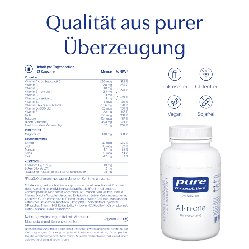 Mit All-in-one von Pure Encapsulations haben unsere Experten eine einzigartige Kombination entwickelt, damit du deine Gesundheit jeden Tag optimal unterstützen kannst. Die Basisversorgung liefert dir zwölf Vitamine, acht Mineralstoffe und Spurenelemente sowie Coenzym Q10 (CoQ10), Lutein und Polyphenole aus Traubenkern-Extrakt in einer Nahrungsergänzung. Ganz egal ob du Stress im Job hast, die Zeit, um gesund zu kochen nicht ausreicht oder du einfach deiner Gesundheit etwas Gutes tun möchtest: Mit unseren Multivitamin Kapseln kannst du deinen Lebensstil ganz einfach sowie umfassend unterstützen und das schon ab einer Kapsel pro Tag.