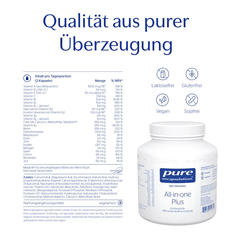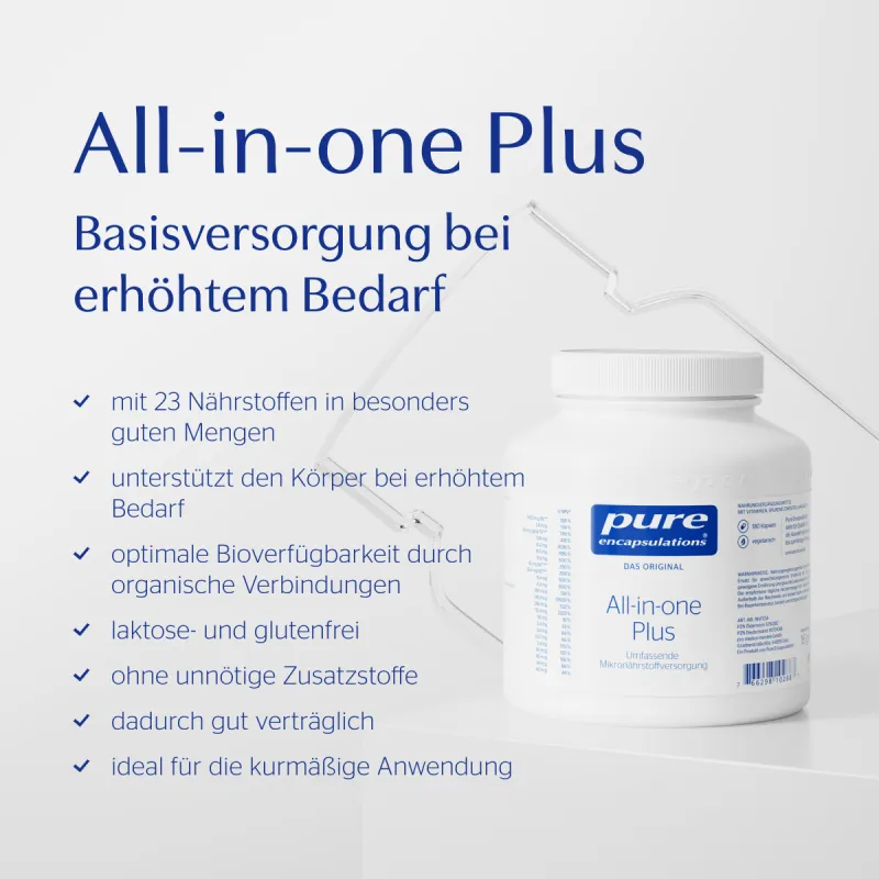 All-in-one Plus liefert eine gezielte Mikronährstoffbasis für Phasen mit erhöhtem Bedarf. Jede Kapsel enthält 23 essenzielle Nährstoffe in besonders guten Mengen – inklusive aktivierter B-Vitamine und organischer Verbindungen für eine optimale Bioverfügbarkeit.