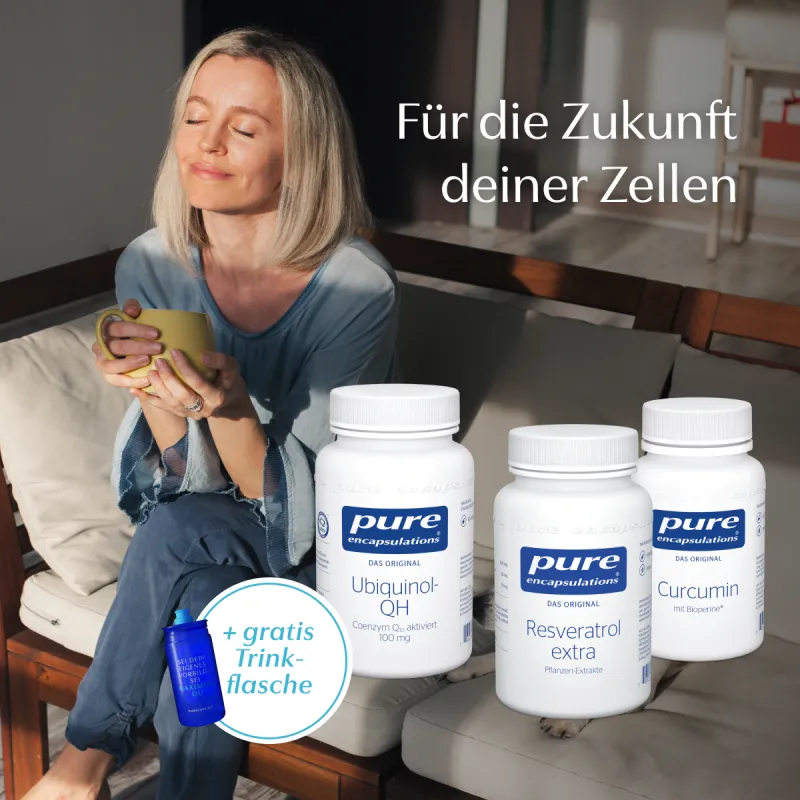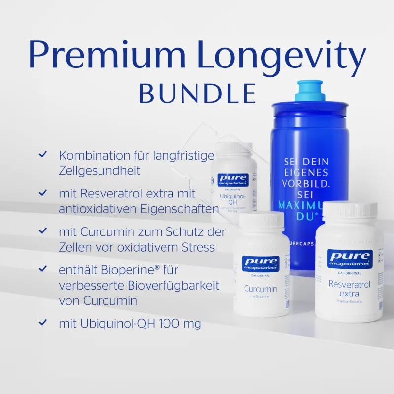 Das Premium Longevity Bundle kombiniert drei Mikronährstoffe, die auf unterschiedliche Weise zu einer bewussten Longevity-Routine beitragen. Curcumin trägt zum Schutz der Zellen vor oxidativem Stress bei, Resveratrol extra liefert pflanzliche Polyphenole mit antioxidativen Eigenschaften und Ubiquinol-QH ergänzt die Kombination als bioaktive Form von Coenzym Q10. Gemeinsam unterstützen sie den Erhalt gesunder Zellstrukturen und tragen zu einem ausgewogenen antioxidativen Gleichgewicht bei.