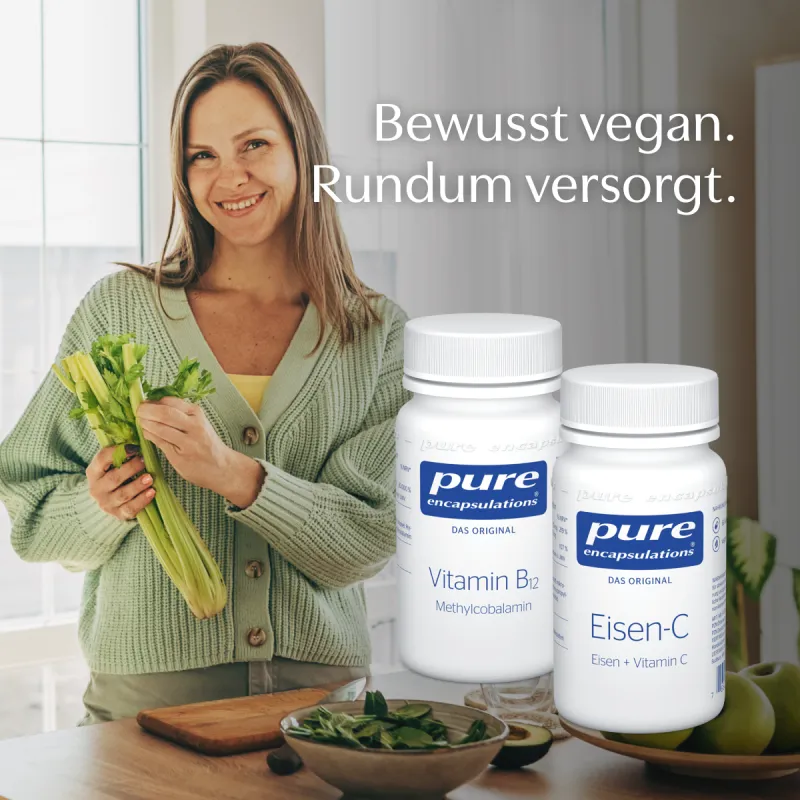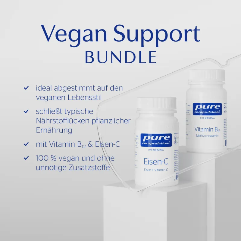 Vegan zu leben bedeutet, bewusst auf die Ernährung zu achten. Doch selbst bei ausgewogener Ernährung kann es zu Versorgungslücken kommen – besonders bei Vitamin B12 und Eisen. Diese Mikronährstoffe sind in pflanzlichen Lebensmitteln nur begrenzt oder in schwer verwertbarer Form enthalten, wie zahlreiche Studien belegen. Die Deutsche Gesellschaft für Ernährung empfiehlt daher, Vitamin B12 bei veganer Ernährung regelmäßig zuzuführen. Auch beim Spurenelement Eisen zeigen Untersuchungen, dass pflanzliches Nicht-Häm-Eisen vom Körper weniger effizient aufgenommen wird als Eisen aus tierischen Quellen. Das Vegan Support Bundle soll genau diese Lücken gezielt schließen. Es kombiniert die Produke Vitamin B12 und Eisen-C in hochwertiger, optimal abgestimmter Form – für alle, die bewusst vegan leben und ihre Ernährung intelligent ergänzen möchten.