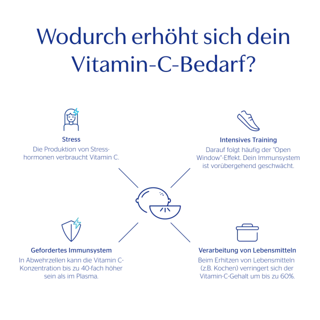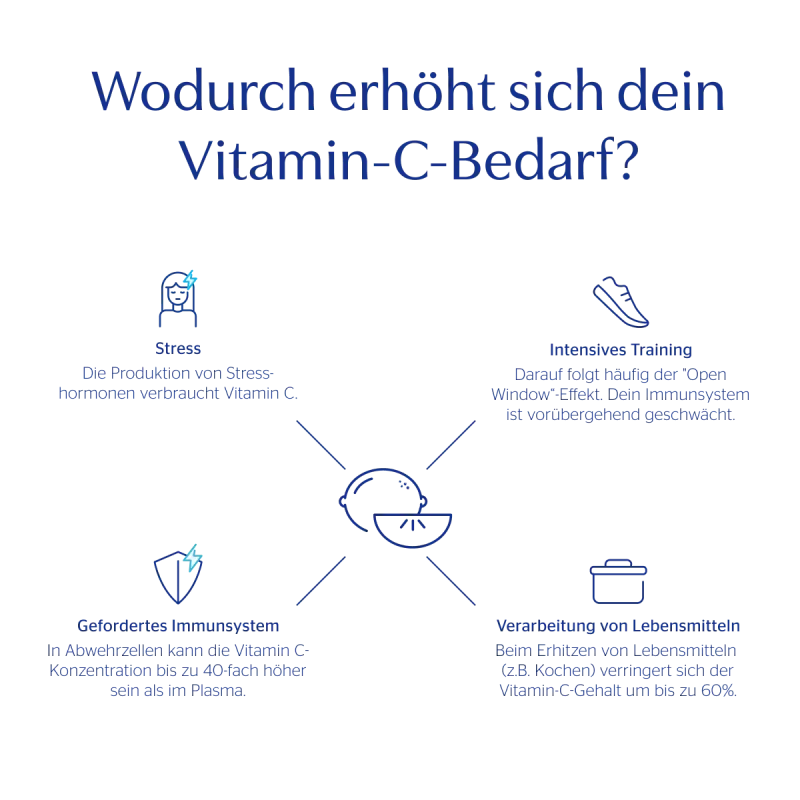 Die Deutsche Gesellschaft für Ernährung (DGE) empfiehlt für gesunde Frauen eine Zufuhr von 95 mg Vitamin C pro Tag und für gesunde Männer 110 mg Vitamin C pro Tag. Dein tatsächlicher Bedarf kann jedoch deutlich steigen – etwa durch Stress oder intensives Training. Außerdem können bei der Verarbeitung von Lebensmitteln, etwa beim Kochen, große Mengen an Vitamin C verloren gehen.